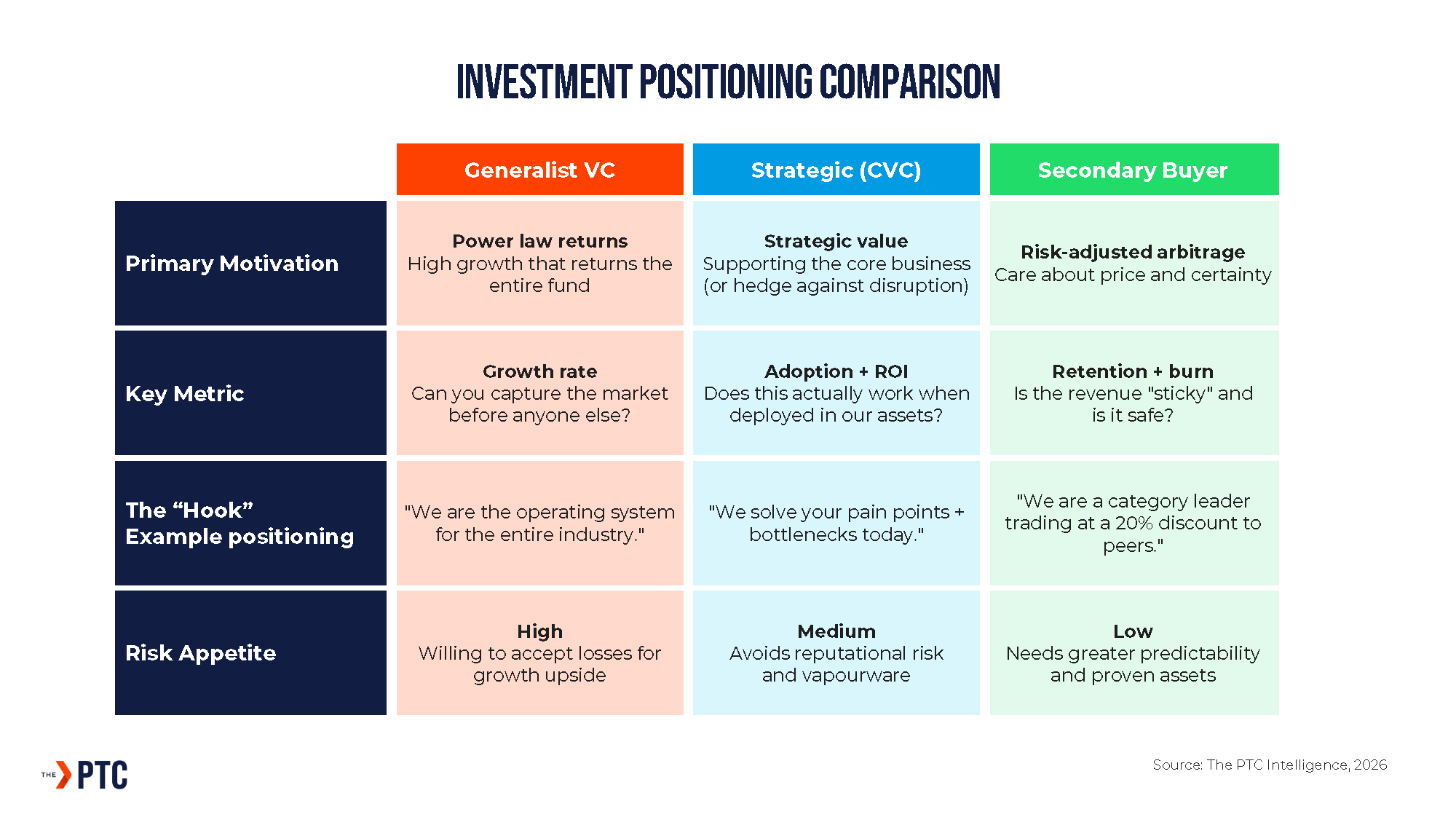 Because motivations differ, the narrative and metrics hit in the pitch must also differ. A pitch to a strategic investor needs to highlight different KPIs than a pitch to a generalist VC, which is also a different positioning for the secondary buyer, etc.